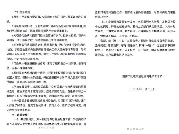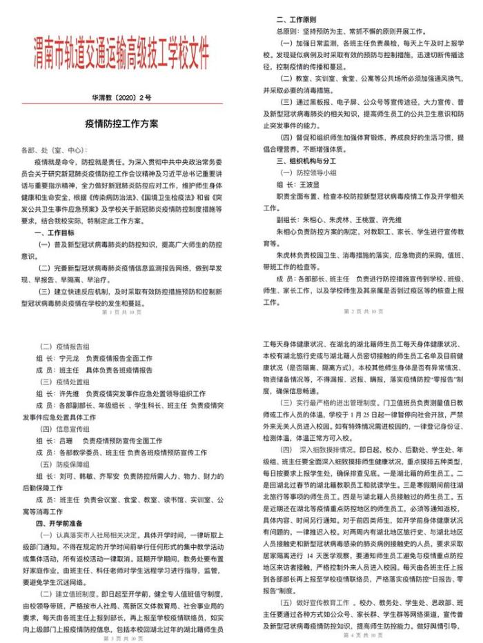 近期工作方向: 1、 防控要提高政治站位,高度重视疫情防控工作。疫情就是命令,防控就是责任。控制疫情蔓延,保障师生安全。是我们每个华山人、轨道人义不容辞的责任和担当,运校将有5000多学生即将返校,在当前疫情防控,陕西省高校疫情防控指南,2020年人社厅关于春季开学防疫指南,渭南市教育局、市人社局、高新区教育局防控指南的指导下,可以清楚地认识到,防控工作责任重大。全体教职员工一定要提高政治站位,任何一个人决不能掉以轻心。全体教职员工和学生都是一个命运共同体,对学生的要求,同样对教职员工要求,每日早午晚体温检查,一刻都不能放松。要精准防控,认真落实,省市区集团学校各类文件要求和工作安排,要扎实开展工作,强化责任意识,要做到守好责任田,护好一校人。要求做到以下四点:一严二清三防四控。一严,严格落实上级文件要求。二清,要政策清,家底清,要把学生教职工寒假的活动和身体情况摸排清楚。三防,一定要防突发事件,防次生事件,防懈怠情绪。四控,控聚集、控流动、控质量、控安全,保证校园这一片净土。 2、要学会感恩,要有担当,要居安思危,如履薄冰。董事长在第一时间开设“华山大讲堂”,用网络将全体师生心聚集在一起,并对全体师生的身体健康情况十分关心,对社会实践一线学生关心关爱,尤其对我校13名湖北籍学生的身体健康高度重视。并且给教职员工及时发放生活费,全体教职员工应心怀感恩。